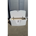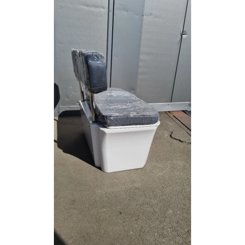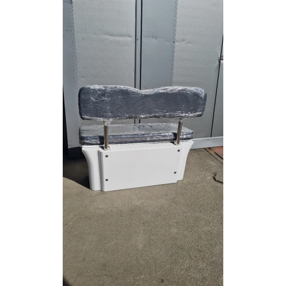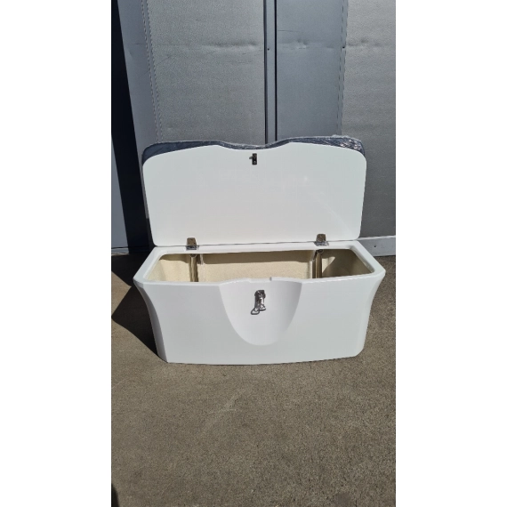 Lagringsrom under sete med låsbart beslag. 80 cm bredde, 50 cm dybde (inkludert rygg), 70 cm høyde.