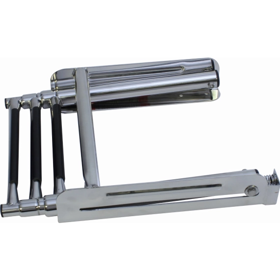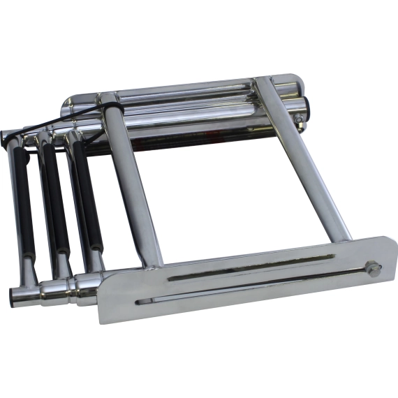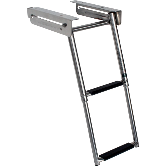 Teleskopstige i kassett for montering under baugspyd, eller plattform. Stigen kan felles inn i kassetten når den ikke er i bruk.