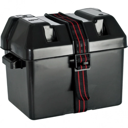 Batterikasse av slagfast polyethylene. Leveres komplett med stropp og beslag for feste til dørken.