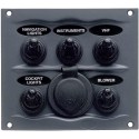 SuperSwitch-brytere ferdig koblet i panel med 5 brytere og automatsikringer i sort.