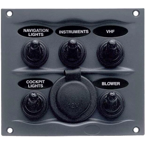Sikringer på baksiden. IP=56. 5 brytere + 12V el.uttak. Mål: 95 x 107 mm