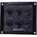 Sprutsikkert bryterpanel med seks vanntette brytere. Sikringer på baksiden av panelet. 12V.