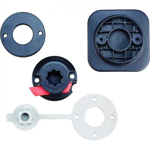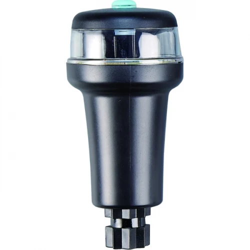 Portabel, rundtlysende LED-lanterne på batteri. Linse er produsert i polykarbonat, lykt og feste i ABS-plast.