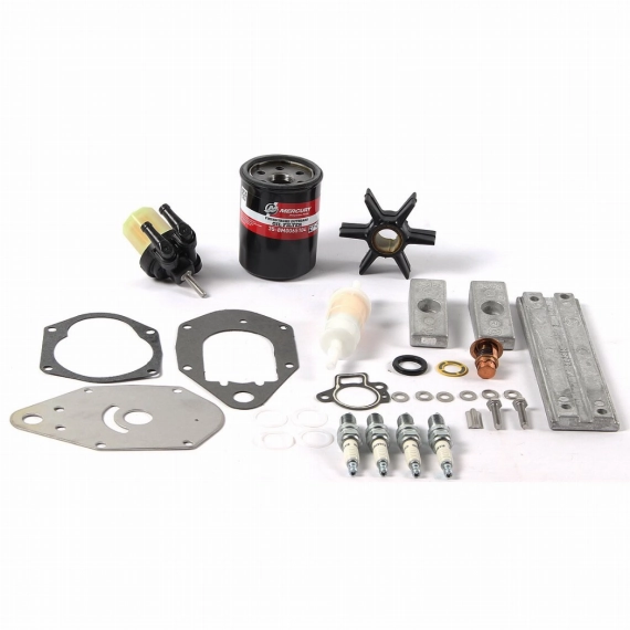 Oljefilter, bensinfiltere, oljedreneringspakning, girhuspakninger, termostat, pakning, tennplugger, impeller kit og anoder.