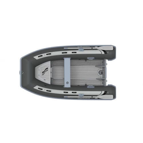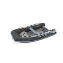 Lett RIB med dobbeltbunn aluskrog og tofte. Mørk grå tube, grått skrog.