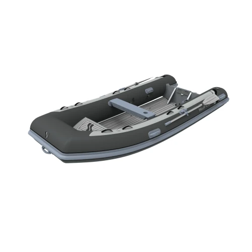 Lett RIB med dobbeltbunn aluskrog og tofte. Mørk grå tube, grått skrog.