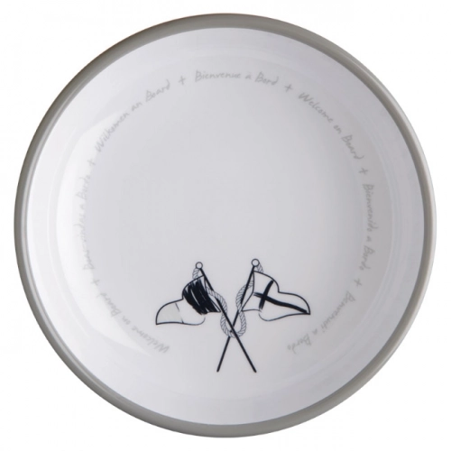 Melamin-dyp tallerken er stor i størrelse og utgjør en del av det uknuselige melamin-serviset Welcome, som har sett med middagsplater, suppe og dessertplater laget av melamin, dekorert i nautisk stil.