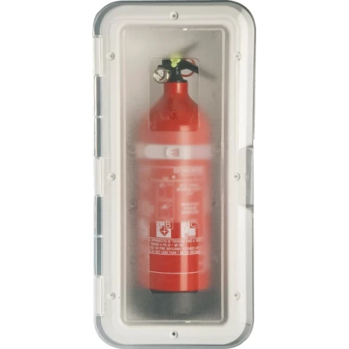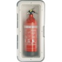 Boks for 2 kg brannslukker med gjennomsiktig lokk.