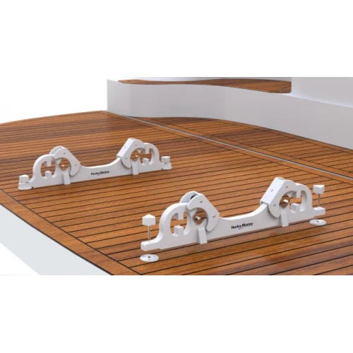 Denne varianten av Hurley Dinghy Chocks er laget for fastmontering. Etter at de er montert, kan de enkelt tas bort ved behov. Sammen med noen festestropper gir Dinghy Chocks en trygg og stabil transport av din lettbåt på badeplattformen.