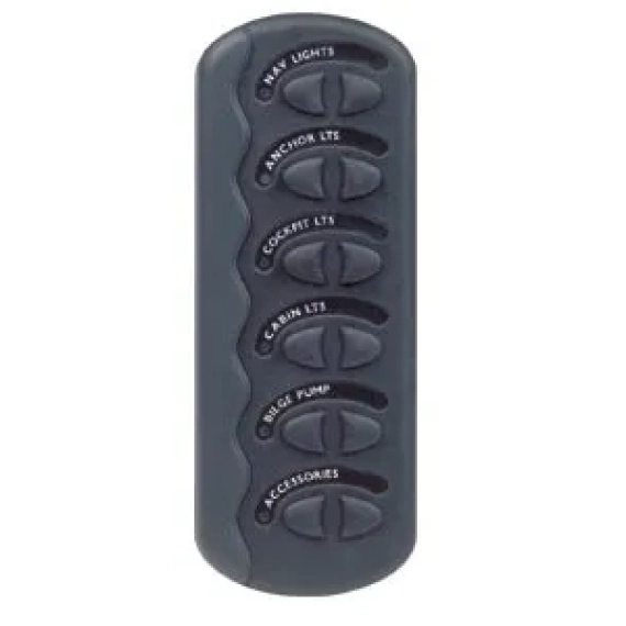 Sprutsikre paneler med bakgrunnsbelyste etiketter som viser om bryteren er slått av eller på (grønn/rød).