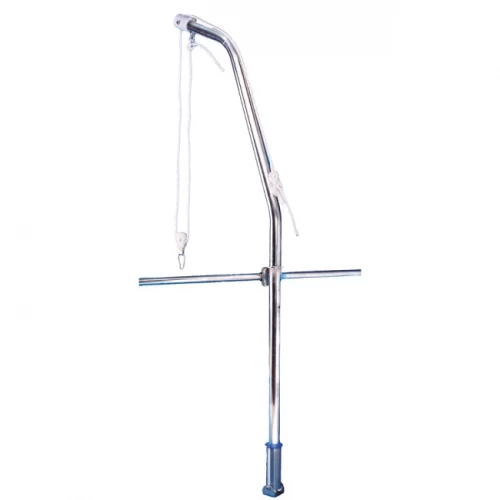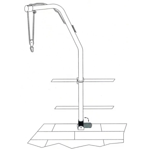 Spar ryggen når jolle-motoren skal ombord! Svingbar motordavit i syrefast stål. Leveres komplett med festebeslag for pushpit, blokker, tau og karabinkrok.