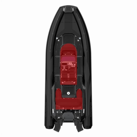 Dekker akterbenk, sittekonsoll og styrekonsoll på Grand 750 Golden Line. Se røde felt for å se hvor trekket dekker.