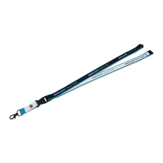 Det trefargede, 20 mm brede båndet i svart, hvit og blå polyester har vevde Mercury-Avator-logoer over hele lengden.