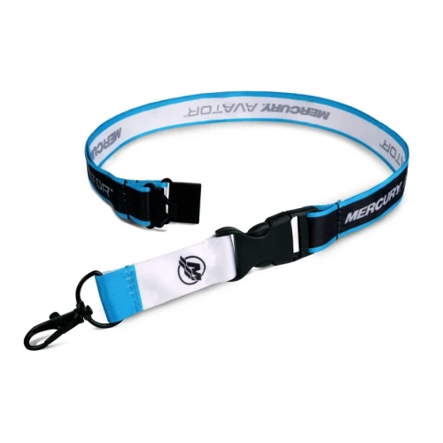 Det trefargede, 20 mm brede båndet i svart, hvit og blå polyester har vevde Mercury-Avator-logoer over hele lengden.