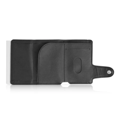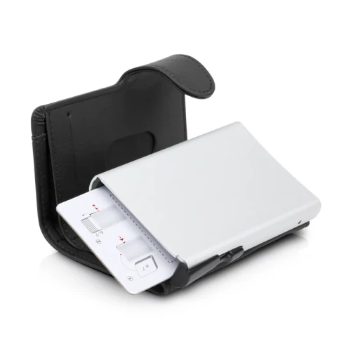 Laget av aluminium og har en skinnlommebok som beskytter mot elektronisk datatyveri. Med denne kortholderen vil du ikke lenger få bøyde eller ødelagte kort. For opptil 10 kort eller 6 pregede kort.