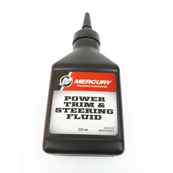 - Mercury Powertrim & Steering Fluid er en hydraulikkolje for power trim/tilt som er blank/klar i fargen.