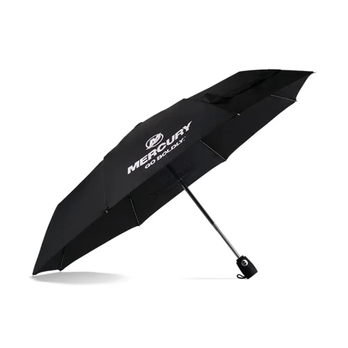 Den svarte, sammenleggbare paraplyen med en diameter på ca. 97 mm har et klassisk design som fullendes med hvit Mercury-logo på 2 sider. Det følger også med et hylster for oppbevaring av paraplyen.