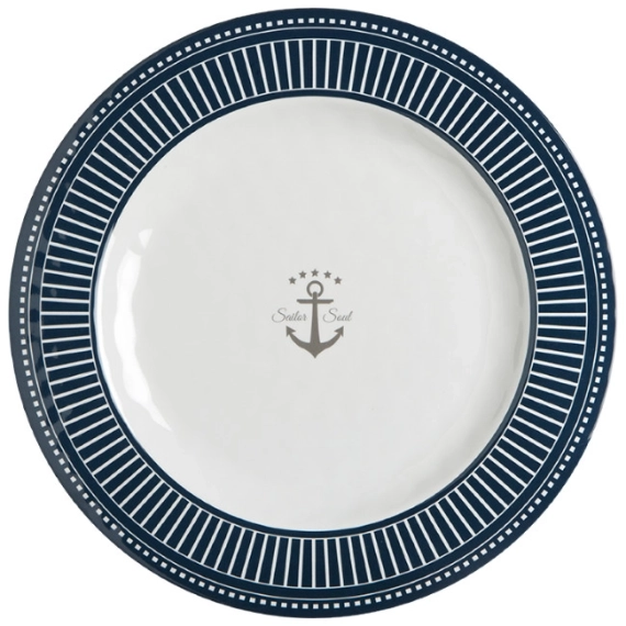Melamin-middagstallerken er stor i størrelse og utgjør en del av det uknuselige melamin-serviset Sailor Soul, som har sett med middagsplater, suppe og dessertplater laget av melamin, dekorert i nautisk stil.