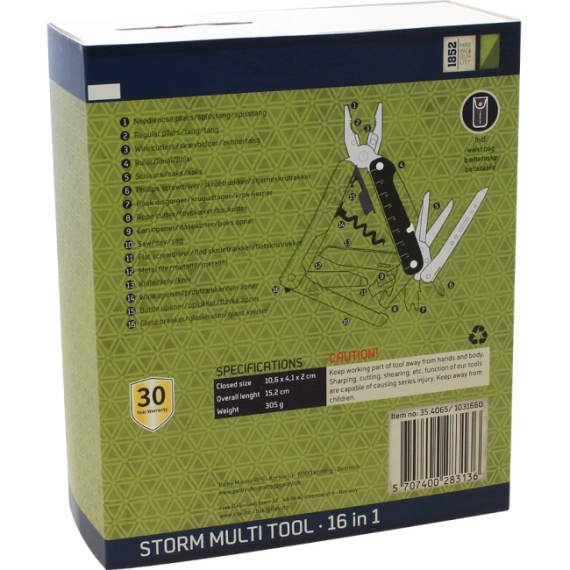 Solid og praktisk multiverktøy med 16 funksjoner og hele 30 års garanti.