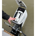 Litiumionbatteriet på 1 kWh har ingen kabler å koble til. Den glir på plass under den vippbare toppdekselet, og sparer deg for verdifull plass i båten. Trenger du å kjøre enda lenger? Ikke noe problem. Du kan ta med et tilgjengelig reservebatteri som byttes på plass i løpet av sekunder.