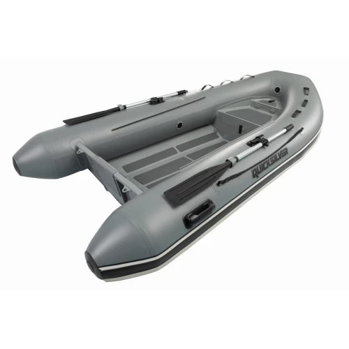 - Quicksilver 270 Ultra Light Alu RIB – Lengde: 270 cm. – Bredde: 162 cm. – Antall personer: 3 – maks motor: 10 HK – Vekt: 38 kg. – Stammelengde: Kort – Pontongdiameter: 40 cm – Ant kamre: 3 – Kjølbeskyttelse: Ja – Dørktype: Ultra Light V-bunn – Farge: Lys grå