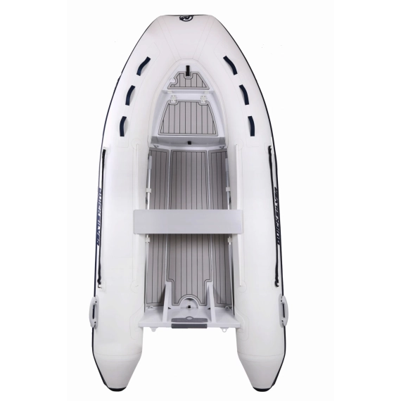 - Quicksilver 320, 350, 380 & 420 Aluminium RIB har et dobbeltbunnet og moderne 3-D skrog.