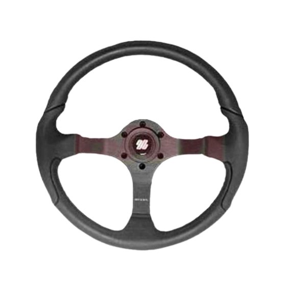 Rattet har et tre-eikers design med et mykt grep i sort skinnlook og sorte eiker.