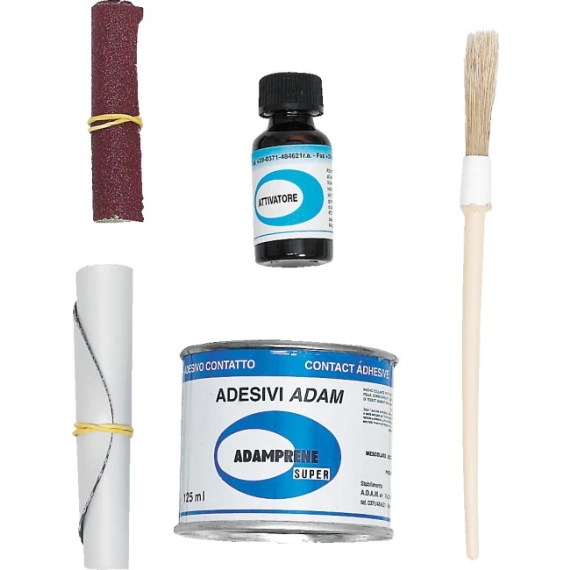 Komplett reperasjonssett for gummibåt i gummi. Inneholder cleaner, lim, herder, kost og lapp.