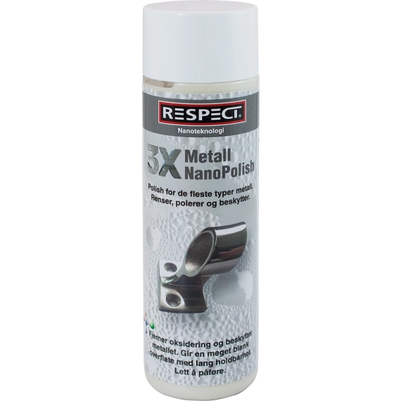 Produktet renser, polerer og beskytter. Inneholder ikke oljer eller silikoner. Rensestoffene i 3X Metall NanoPolish fjerner effektivt oksidering og rust i overflaten, og gir glød tilbake i gammel eloksert aluminium. 3X Metall NanoPolish binder seg sterkt i overflaten og gir vesentlig lenger holdbarhet enn voksbaserte produkter. Gir høy glans og forsegler overflaten på syrefast stål, aluminium, kobber, messing m.m.