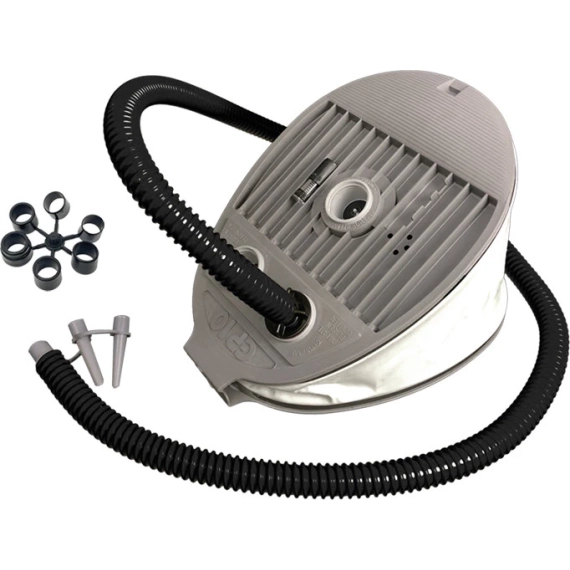 Fotpumpe med 7 munnstykker og 2 spisse ventiler til alle type gummibåter og RIB. Med høytrykksventil for oppblåsbare dørk.