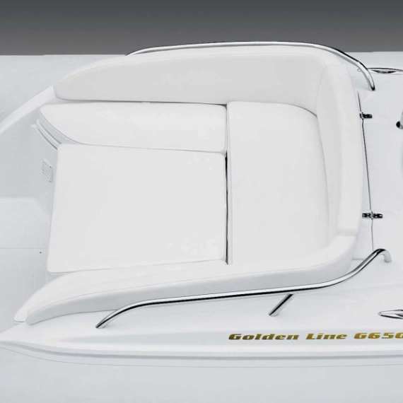 Grand Golden Line 650 solseng akter. Få full utnyttelse av din båt, lag en sjeselong/solseng akter i båten. Slapp av med din kjære eller la barna kose seg i den polstrede kroken. Solseng består av en plate som legges i U-sofaen og en pute på toppen. Solsengen får plass i akterrommet når den ikke er i bruk.