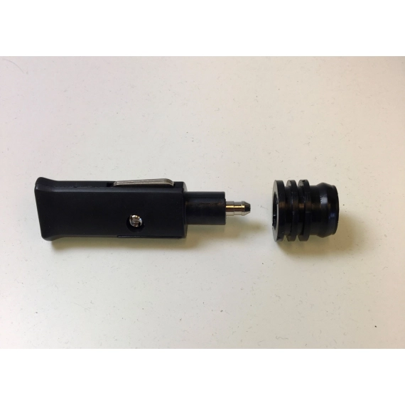 Støpsel i sort plast som passer både til mindre og større kontakter. Til større kontakter setter man på en spesiell adapter