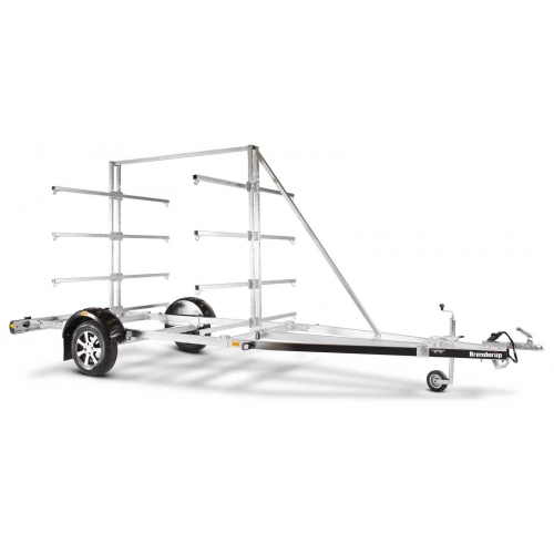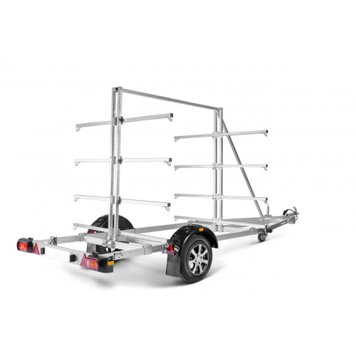 Båttilhenger for kano/kajakk med plass for opp til 8 kanoer eller 16 kajakker. Stativene er enkle å regulere og kan lett tilpasses størrelsen på din kano/kajakk. Utstyrt med V-formet tilhengerdrag og utmerkede kjøreegen-skaper. Varmgalvanisert understell sikrer din tilhenger lang holdbarhet. De elektriske ledningene ligger helt skjult og godt beskyttet inne i tilhengerens understell. Vanntette hjullagre forlenger levetiden. Selve stativet har følgende mål, høyde 200 cm, lengde 199 cm, bredde 191 cm, lastelengde 344 cm og lastebredde per side 85 cm. Båthengeren som er vist på bildet kan ha ekstrautstyr.